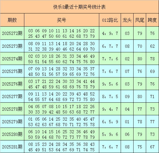 孤高8第2025281期奖号为:08 15 23 24 28 34 35 36 38 43 45 49 51 53 64 67 69 71 74 75,其中奖号012路比为7:6:7,0路号码(7个):15、24、36、45、51、69、75,1路号码(6个):28、34、43、49、64、67,2路号码(7个):08、23、35、38、53、71、74。