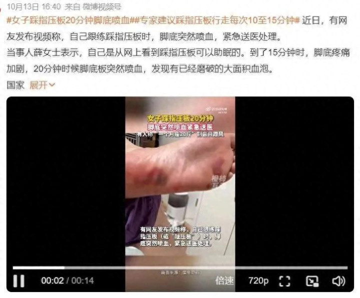 日前,有网友发视频称,我方跟练踩趾压板时,脚底瞬息喷血,遑急送医处置。当事东谈主薛女士暗示,我方从网上看到踩趾压板不错助眠,踩了10多分钟合计挺有成果,15分钟傍边瞬息诡秘加重。但薛女士以为“痛则欠亨”,忍痛踩到20分钟时脚底瞬息喷血,这才发现存脚底大面积血泡况兼有的已被磨破。